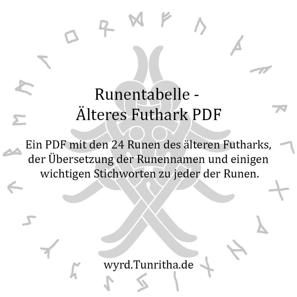 Ein PDF mit den 24 Runen des älteren Futharks, der Übersetzung der Runennamen und einigen wichtigen Stichworten zu jeder der Runen.